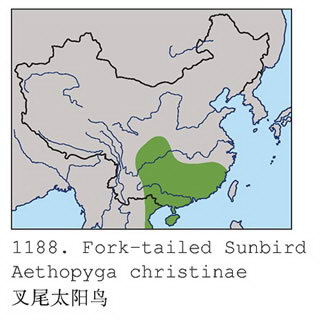 描述:体小(10厘米)而纤弱的太阳鸟。顶冠及颈背金属绿色,上体橄榄色或近黑,腰黄。尾上覆羽及中央尾羽闪辉金属绿色,中央两尾羽有尖细的延长,外侧尾羽黑色而端白。头侧黑色而具闪辉绿色的髭纹和绛紫色的喉斑。下体余部污橄榄白色。雌鸟甚小,上体橄榄色,下体浅绿黄。指名亚种两翼较黑。 详细见: →叉尾太阳鸟百科