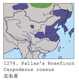 描述:中等大小(16厘米)而体型矮胖的朱雀。尾略长。雄鸟:头、下背及下体绯红;头顶色浅,额及颏霜白;无对比性眉纹;上体及覆羽深褐,边缘粉白;胸绯红,腹部粉色,具两道浅色翼斑。雌鸟:色暗,上体具褐色纵纹,额及腰粉色,下体皮黄色而具纵纹,胸沾粉色,臀白。 详细见: →北朱雀百科
