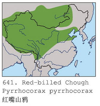 习性:飞行甚敏捷,在热气流上玩耍,滑翔时短宽的两翼及显见的初级飞羽"翼指"张开。红嘴山鸦结小群至大群活动,生活于青藏高原及喜马拉雅山脉的中高海拔区、中国东北部较低海拔处的建筑物及农场周围。