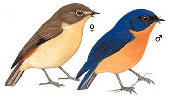 描述:体甚小(10厘米)而嘴狭的仙鹟。雄鸟上体蓝色,头顶及腰辉蓝,眼罩黑,下体橘黄,臀浅色。雌鸟:上体褐,腰及尾棕色,下体浅黄,胸沾皮黄。 详细见: →侏蓝仙鹟百科