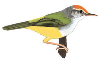 描述:体小(12厘米)的棕顶冠、黄色腹森林莺类。具明显的黄色眉纹,上体橄榄绿色,颏、喉及上胸部灰白,下胸及腹部为鲜艳黄色。 详细见: →栗头缝叶莺百科